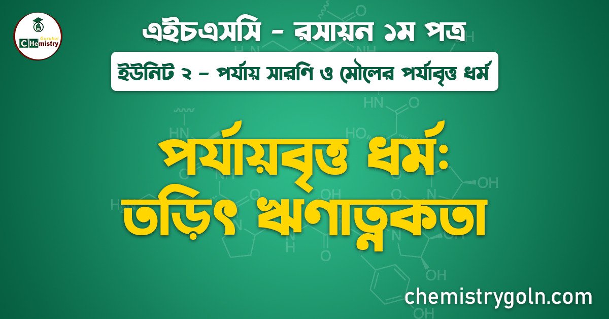পর্যায়বৃত্ত ধর্ম: তড়িৎ ঋণাত্নকতা আমাদের আজকের আলোচনার বিষয়। এই পাঠটি “এইচএসসি রসায়ন ১ম পত্র” এর  “পর্যায় সারণি ও মৌলের পর্যাবৃত্ত ধর্ম” ইউনিট ২ এর অন্তর্ভুক্ত