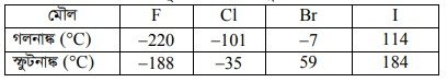 সারণি-৯ : গ্রুপ-17 মৌলসমূহের গলনাঙ্ক ও স্ফুটনাঙ্ক