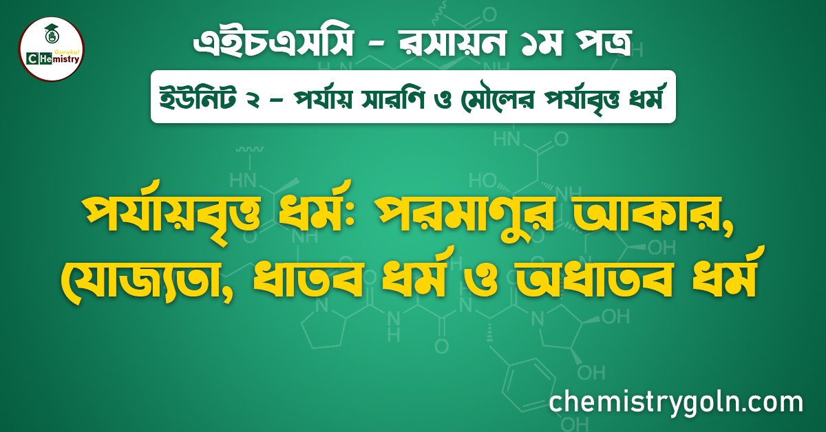 পর্যায়বৃত্ত ধর্ম: পরমাণুর আকার, যোজ্যতা, ধাতব ধর্ম ও অধাতব ধর্ম আমাদের আজকের আলোচনার বিষয়। এই পাঠটি “এইচএসসি রসায়ন ১ম পত্র” এর “পর্যায় সারণি ও মৌলের পর্যাবৃত্ত ধর্ম” ইউনিট ২ এর অন্তর্ভুক্ত