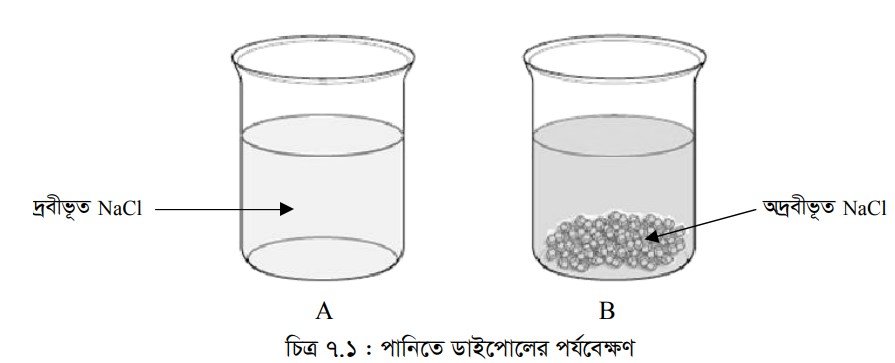 তত্ত্ব ঃ পোলার দ্রব পোলার দ্রাবকে এবং অপোলার দ্রব অপোলার দ্রাবকে দ্রবীভূত হয়ে থাকে। নিচে পরীক্ষার সাহায্যে পানিতে যে ডাইপোল বিদ্যমান তা পর্যবেক্ষণ করা যাবে। দুটি পাত্রের একটিতে পানি এবং অপরটিতে সমপরিমাণ কেরোসিন তেল নিয়ে উভয় পাত্রে নির্দিষ্ট পরিমাণ খাদ্য লবণ NaCl যোগ করলে নিম্নলিখিত পর্যবেক্ষণ লক্ষ্য করা যায়।