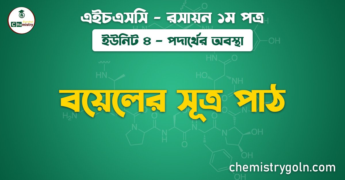 বয়েলের সূত্র পাঠ আমাদের আজকের আলোচনার বিষয়। এই পাঠটি “এইচএসসি রসায়ন ১ম পত্র” এর “পদার্থের অবস্থা” ইউনিট ৪ এর অন্তর্ভুক্ত।