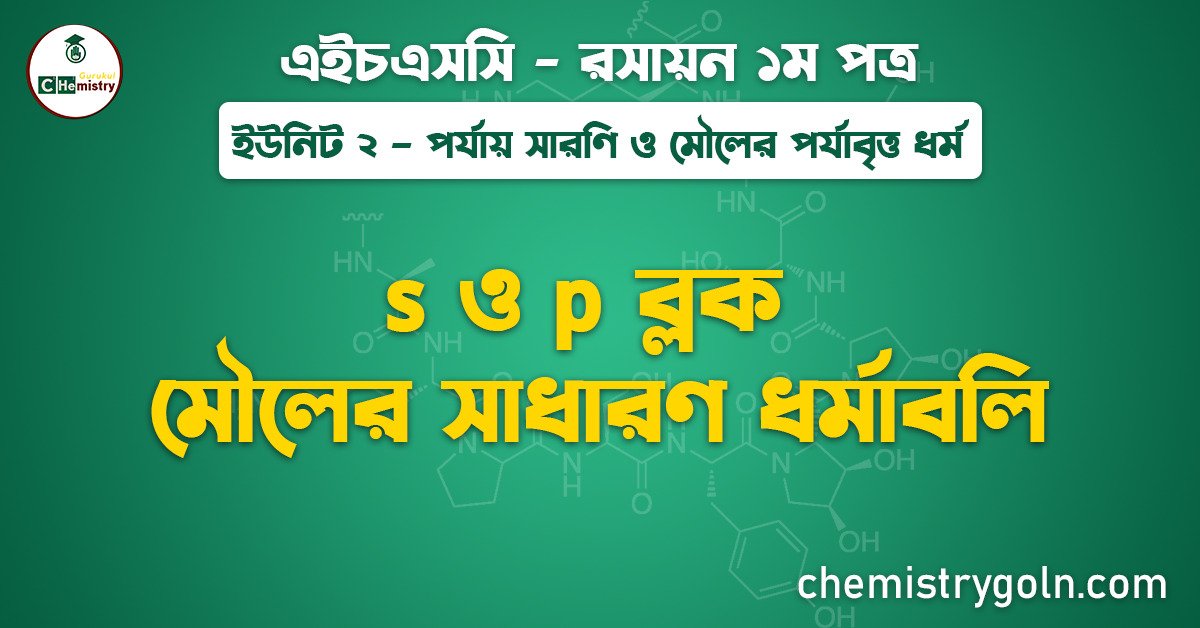 s ও p ব্লক মৌলের সাধারণ ধর্মাবলি আমাদের আজকের আলোচনার বিষয়। এই পাঠটি “এইচএসসি রসায়ন ১ম পত্র” এর “পর্যায় সারণি ও মৌলের পর্যাবৃত্ত ধর্ম” ইউনিট ২ এর অন্তর্ভুক্ত