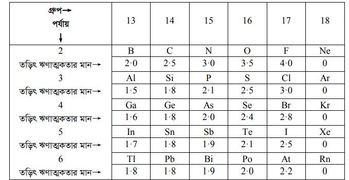 18তম গ্রুপের মৌলসমূহ নিষ্ক্রিয় মৌল। (vi) তড়িৎ ঋণাত্মকতা (Electronegativity) : p ব্লক মৌলের ক্ষেত্রে পর্যায় বরাবর বাম থেকে ডানের দিকে অগ্রসর হলে তড়িৎ ঋণাত্মকতা বাড়তে থাকে। গ্রুপ বরাবর উপর থেকে নিচের দিকে গেলে তড়িৎ ঋণাত্মকতা কমতে থাকে। সাধারণভাবে ধাতব মৌল অপেক্ষা অধাতব মৌলের মধ্যে তড়িৎ ঋণাত্মকতা ধর্মের বৃদ্ধি ঘটে। p ব্লক মৌলের তড়িৎ ঋণাত্মকতা মানের সারণি-