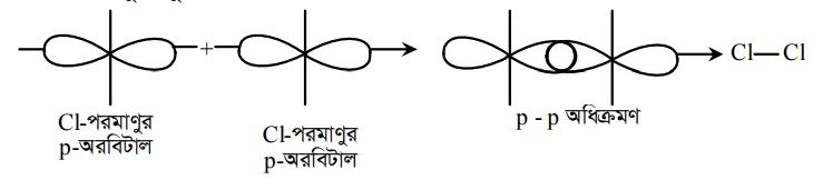 (গ) p –p অধিক্রমণের মাধ্যমে : এক্ষেত্রে দুটি p-অরবিটালের মুখোমুখি অধিক্রমণের ফলে o-বন্ধনের সৃষ্টি হয়। দুটি p-অরবিটাল সরলরৈখিক অবস্থানে মুখোমুখি অধিক্রমণ করে একটি সমযোজী সিগমা (০)-বন্ধন গঠন করে । এক্ষেত্রে অণু গঠনকারী দুটি পরমাণুর Px অরবিটালে মুখোমুখি অধিক্রমণের জন্য সাধারণত বিবেচনা করা হয়। যদি পরমাণু দুটির নিউক্লিয়াসের সংযোজক রেখাকে (molecular axis) y বা z ধরে নেওয়া হয়, তবে অধিক্রমণের জন্য পরমাণু দুটির অরবিটালদ্বয় py এবং pz বিবেচনা করা হয়। উদাহরণস্বরূপ Cl2 অণুর সৃষ্টির ক্ষেত্রে দুটি ক্লোরিন পরমাণু প্রত্যেকের 3pz-অরবিটালের বিপরীত স্পিনযুক্ত অযুগ্ম ইলেকট্রন পরস্পরের মুখোমুখি অধিক্রমণ করে ০-বন্ধন গঠন করে থাকে।
