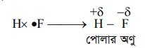 কিন্তু যদি বন্ধনে অংশগ্রহণকারী পরমাণুদ্বয়ের মধ্যে তড়িৎ ঋনাত্মকতার পার্থক্য হয় (যেমন— HF অণুর ক্ষেত্রে H = 2.1 এবং F 4.0) তবে শেয়ারকৃত ইলেকট্রন যুগলের উপর তীব্র তড়িৎ ঋণাত্মক পরমাণু অপেক্ষা কম = তড়িৎ ঋণাত্মক পরমাণুর আকর্ষণ বলের মান কম হয় ফলে শেয়ারকৃত ইলেকট্রন যুগল তীব্র তড়িৎ ঋণাত্মক পরমাণুর দিকে সরে যায়। এ কারণে তীব্র তড়িৎ ঋণাত্মক পরমাণুতে আংশিক ঋণাত্মক চার্জ এবং কম তড়িৎ ঋণাত্মক পরমাণুতে আংশিক ধনাত্মক চার্জের সৃষ্টি হয়। অণুর দুই প্রান্তে ঋণাত্মক এবং ধনাত্মক চার্জ সৃষ্টি হওয়াকে এক্ষেত্রে ডাইপোল (dipole) বলে । কোনো সমযোজী যৌগের অণুতে ডাইপোল সৃষ্টির ধর্মকে ঐ যৌগের পোলারিটি (Polarity) বলে। নিম্নে HF অণুতে ডাইপোল দেখানো হলো :